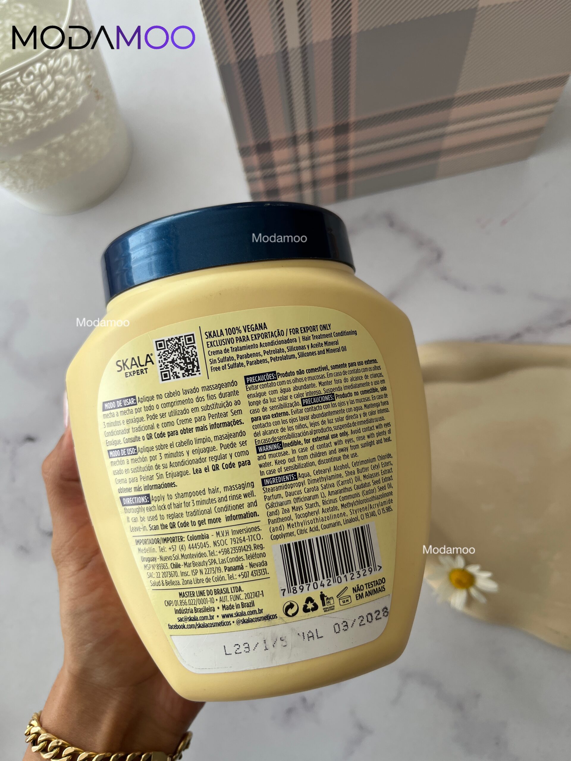 ماسک مو مایونز اسکالا skala، حاوی روغن کرچک، روغن آرگان و پروتین تخم مرغ میباشد که برای مرطوب کردن مو و بازکردن گره های انواع موها طراحی شده است. پرتئین تخم مرغ موجود در این ماسک حاوی ویتامین A میباشد که از خشکی و شکنندگی مو جلوگیری میکند. روغن کرچک با ریزش مو مقابله کرده و روغن آگارن سرشار از اسید چرب و ویتامین E است که ترمیم کننده مو ها آسیب دیده میباشد و باعث درخشش مو میشود. ماسک مایونز اسکالا به افزایش استحکام، مقاومت و انعطلاف پذیری کمک میکند.